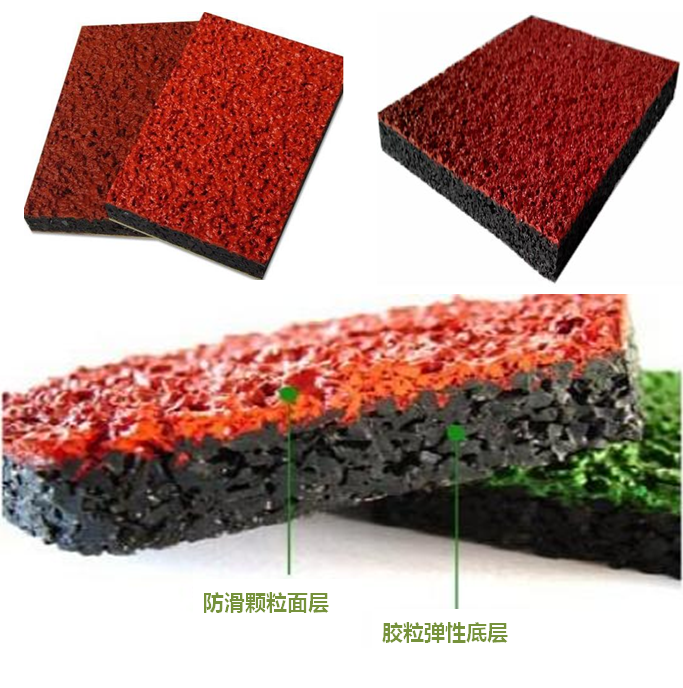 2、 面層采用EPDM(三元乙丙)膠粒,使之具有高度紫外線抵抗力,實踐證明,無褪色,強力耐磨。